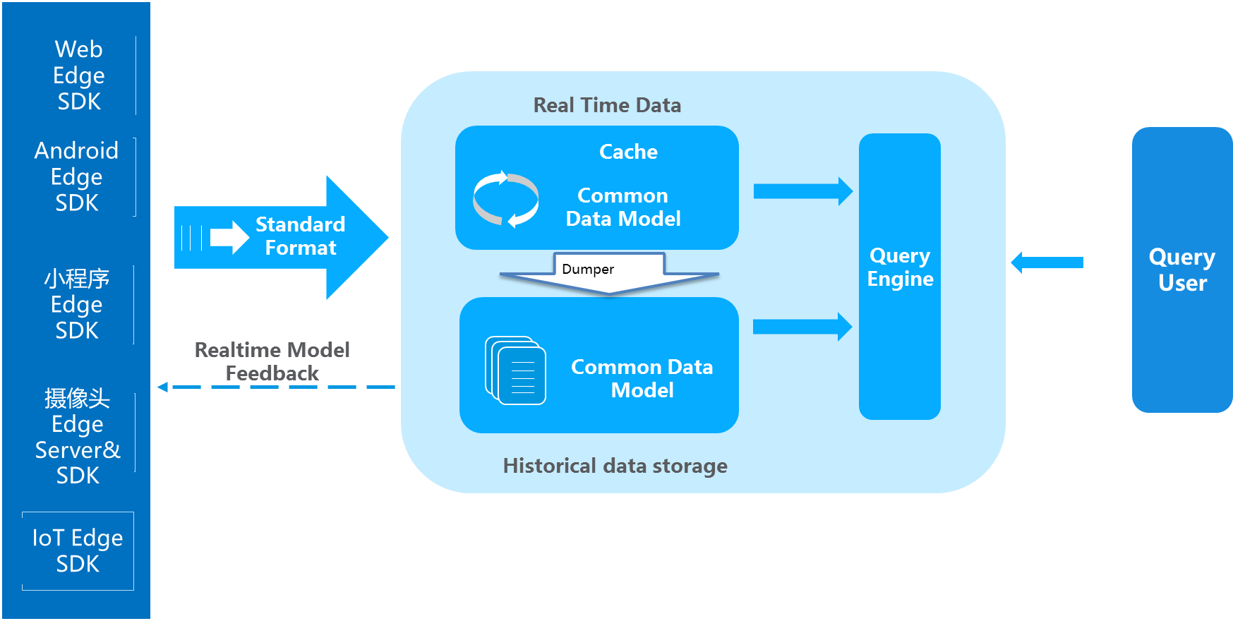 • Historical Data:历史数据沉浸区,这部分是保存了大量的历史数据,为了实现Ad-hoc查询,将自动建立相关索引提高整体历史数据查询效率,从而实现秒级复杂查询百亿条数据的反馈。例如可以使用HDFS存储历史数据,此处的数据模型依然SDK端数据模型是保持一致的Common Data Model。