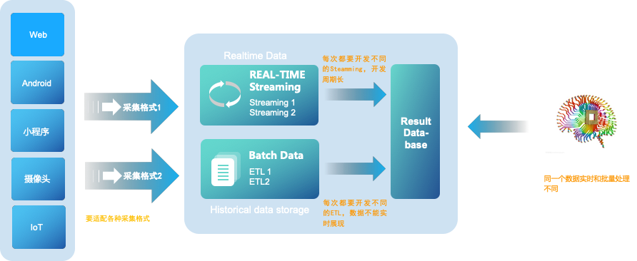 • 批量计算在计算窗口内无法完成:在IOT时代,数据量级越来越大,经常发现夜间只有4、5个小时的时间窗口,已经无法完成白天20多个小时累计的数据,保证早上上班前准时出数据已成为每个大数据团队头疼的问题。