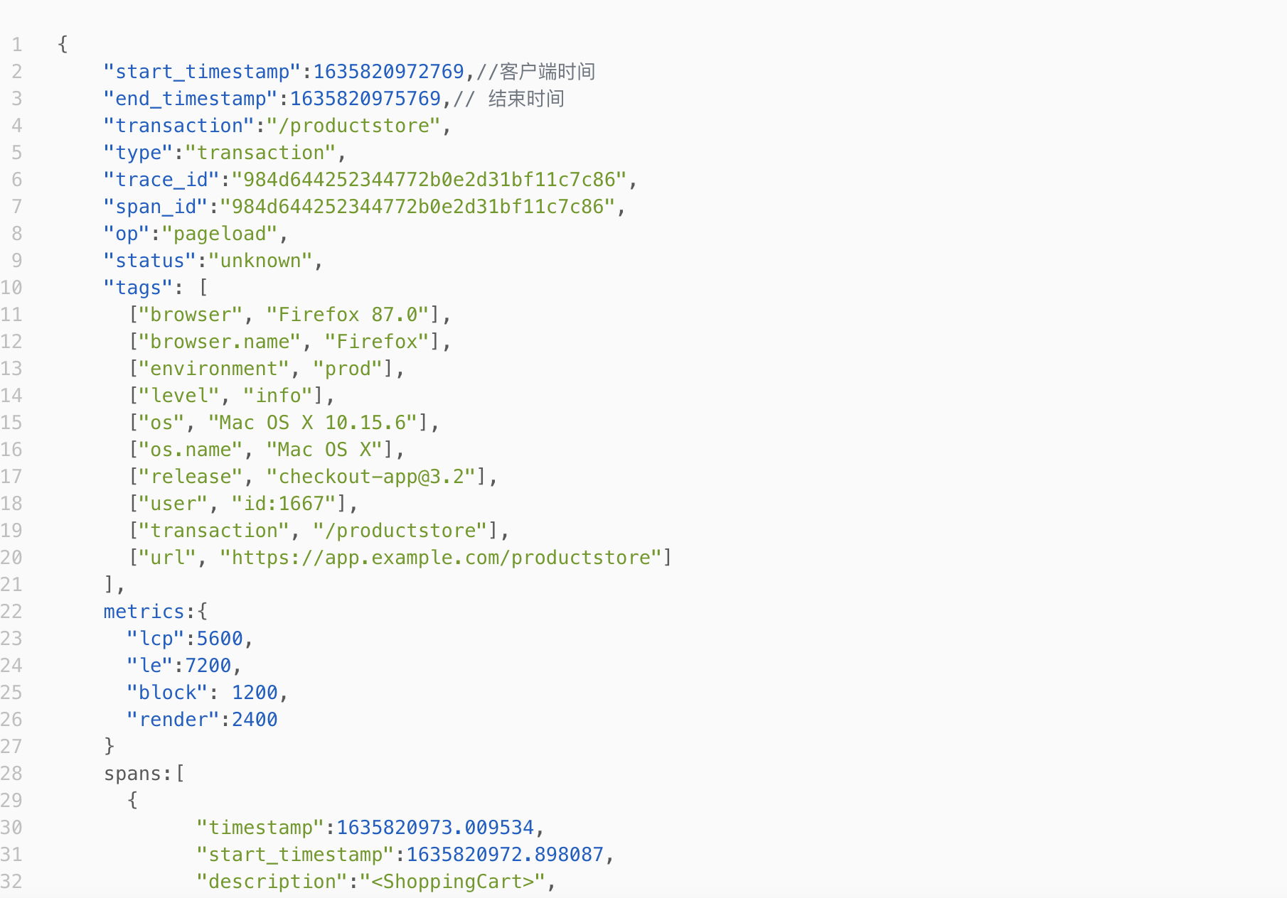 在此示例中,整个页面加载过程,包括上述所有过程,都由单个trace表示。该跟踪将包含以下交易