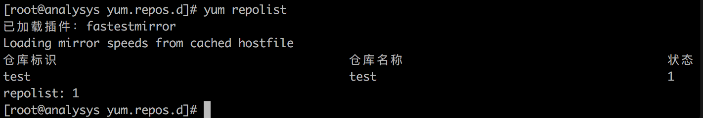 [test] name=test baseurl=http://127.0.0.1:9381/repo1/test/centos7 gpgcheck=0 enabled=1