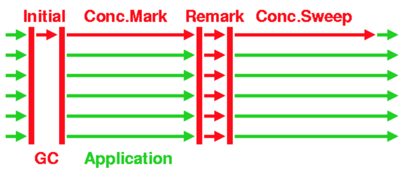 在CMS整个过程中有两个步骤是STW的,如图红色部分
