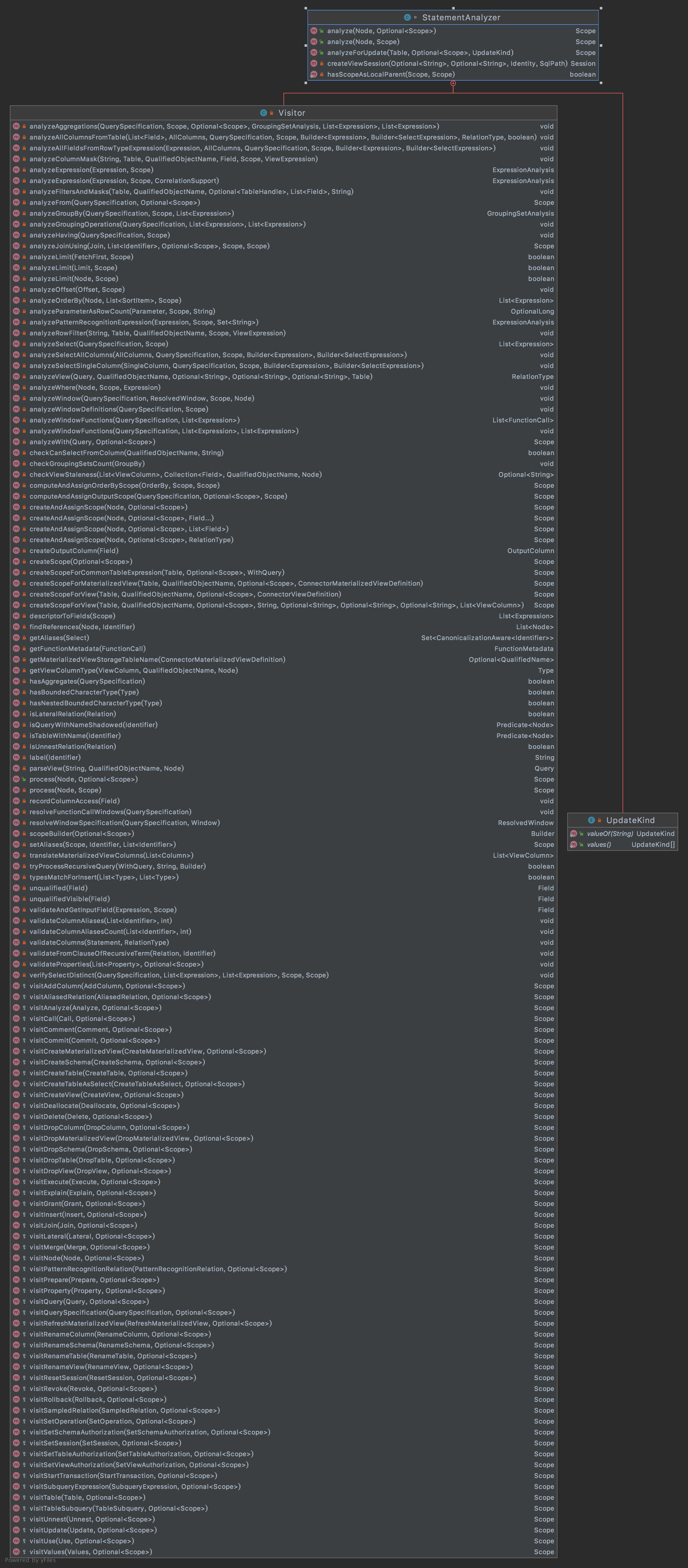StatementAnalyzer 是对Statment进行语义分析的类,针对不同的Statement实现类进行语义分析,具体实现在内部类Visitor,该类的类视图如下所示: