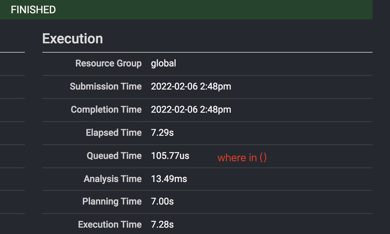 应用端反馈一个涉及功能菜单渲染的基础SQL查询时间超过7秒,原因是where x in (上千个的元素),通过Presto观察,发现这个SQL的查询的时间90%花在了执行计划的解析上,真正查询时间反而很快。通过删减 where in 中的元素,发现SQL就快了很多,也证实了,问题的根本原因在in 元素集合过多