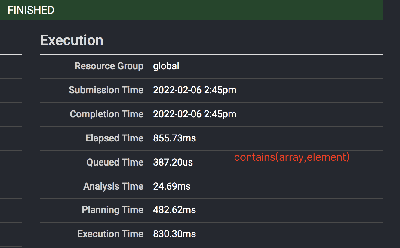 只能换一种sql 写法,当时第一时间想自定义一个RoaringBitMap(RBM)的contains 函数来测试,但是发现presto有一个数组的contains方法,因为RBM如果元素个数小于四千个内部也是数组,于是改写了sql,先试试 数组的contains()函数